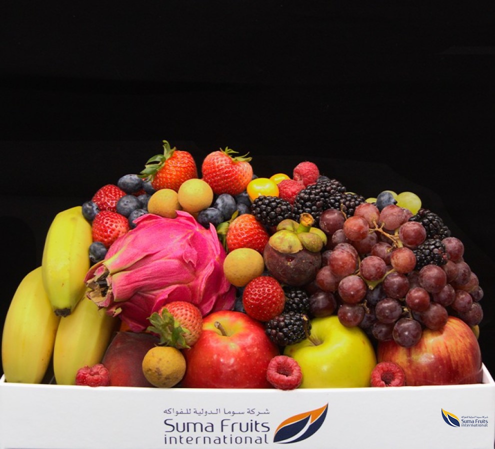 A vibrant fruit box filled with a colourful assortment of fresh, hand-picked fruits, including Apples, Kiwi, Bananas, Grapes, Berries, and Seasonal Specialties. Perfect for snacking, gifting, or adding a healthy touch to any day.
